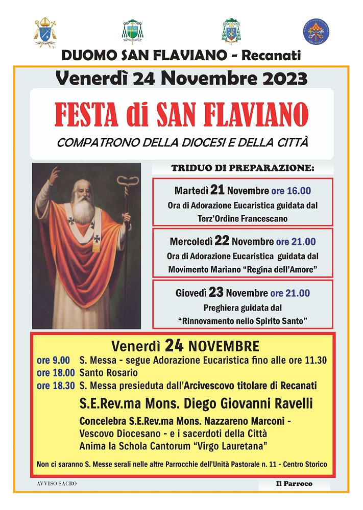 La celebrazione Eucaristica delle ore 18,30 sarà presieduta da S.E. Rev. Mons. Diego Giovanni Ravelli Arcivescovo Titolare di Recanati e concelebra S.E.Rev. Mons. Nazzareno Marconi Vescovo Diocesano.