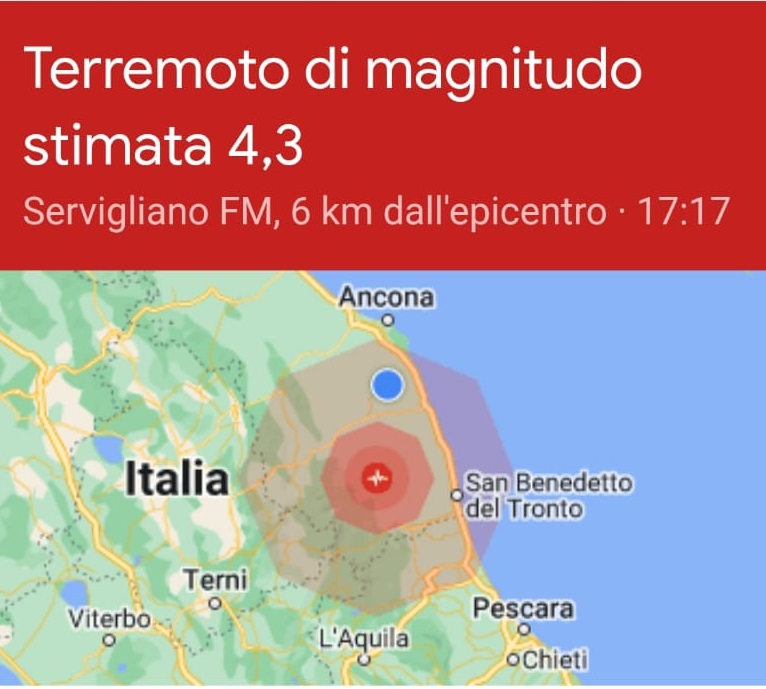Oggi, alle 17.17, si è verificata una scossa sismica nelle Marche. Il terremoto, di magnitudo 4, ha avuto epicentro a pochi chilometri da Montalpro, nella provincia di Fermo. L’ipocentro è stato individuato a una profondità di 21.6 chilometri. Il sisma è stato percepito anche nelle aree di Ancona, Macerata, Civitanova e lungo la costa.