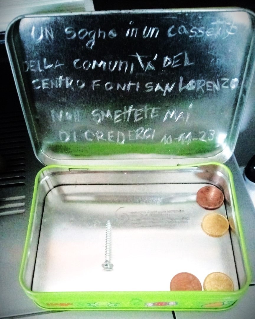 Un’iniziativa che oggi pomeriggio prenderà vita nel quartiere: “con bambini e bambine, ragazzi e ragazze getteremo – comunica l’associazione – nel cemento una cassettina con due spicci e un messaggio per il futuro”. Hanno pensato, quindi, di scrivere sul coperchio della cassettina queste parole: “un sogno in un cassetto della comunità del centro Fonti san Lorenzo. Non smettere mai di crederci. 10 novembre 2023” Dentro qualche monetina: “si tratta della nostra memoria per chi, tra 500 anni, proverà a capire qualcosa in più di noi. Di un noi che vive, si alimenta, sogna, cresce e inventa ogni giorno”.