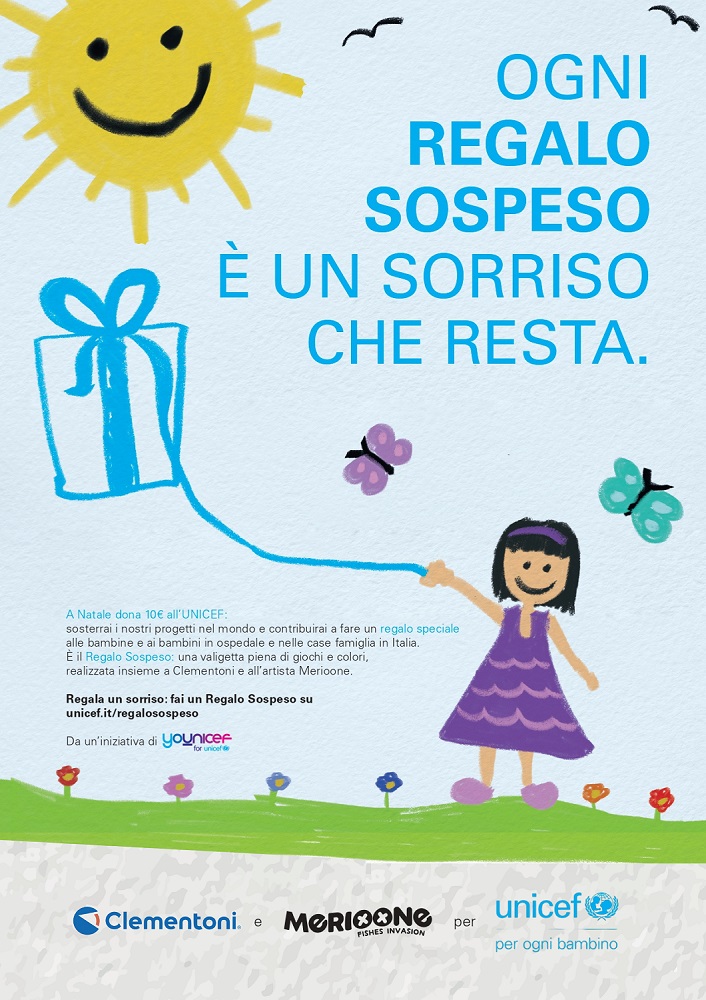 Per questo Natale riparte l’iniziativa del “Regalo sospeso” realizzata dall’UNICEF Italia in collaborazione con Clementoni a favore di 2.500 bambini ospiti in strutture ospedaliere e in case-famiglia in Italia e di tanti bambini vulnerabili nel mondo. I Regali sospesi sono “speciali cofanetti regalo” creati da Clementoni e illustrati dallo street artist romano Merioone, dedicati al tema dei diritti dell’infanzia. Ogni cofanetto, realizzato con materiali di riciclo, contiene: pennarelli, un activity book, un puzzle e un gioco memo.
