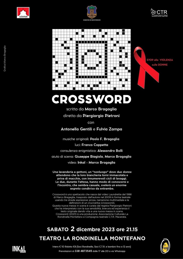 Sabato 2 Dicembre al Teatro “La Rondinella” andrà in scena “CROSSWORD”, spettacolo teatrale scritto da Marco Bragaglia, regia di Piergiorgio Pietroni con Antonella Gentili e Fulvia Zampa. Un approccio artistico per affrontare il tema della violenza di genere, che evidenzia la complessità delle relazioni e mette in luce storie che spesso rimangono invisibili.