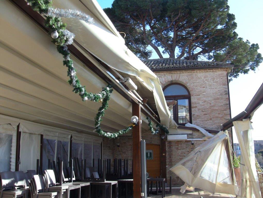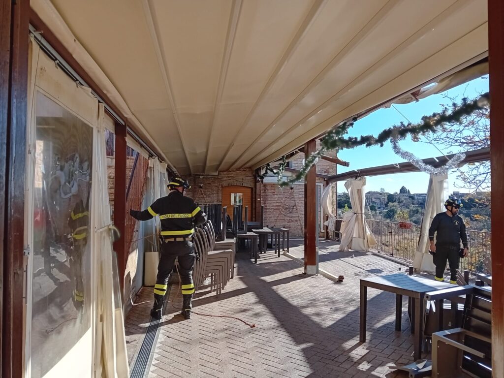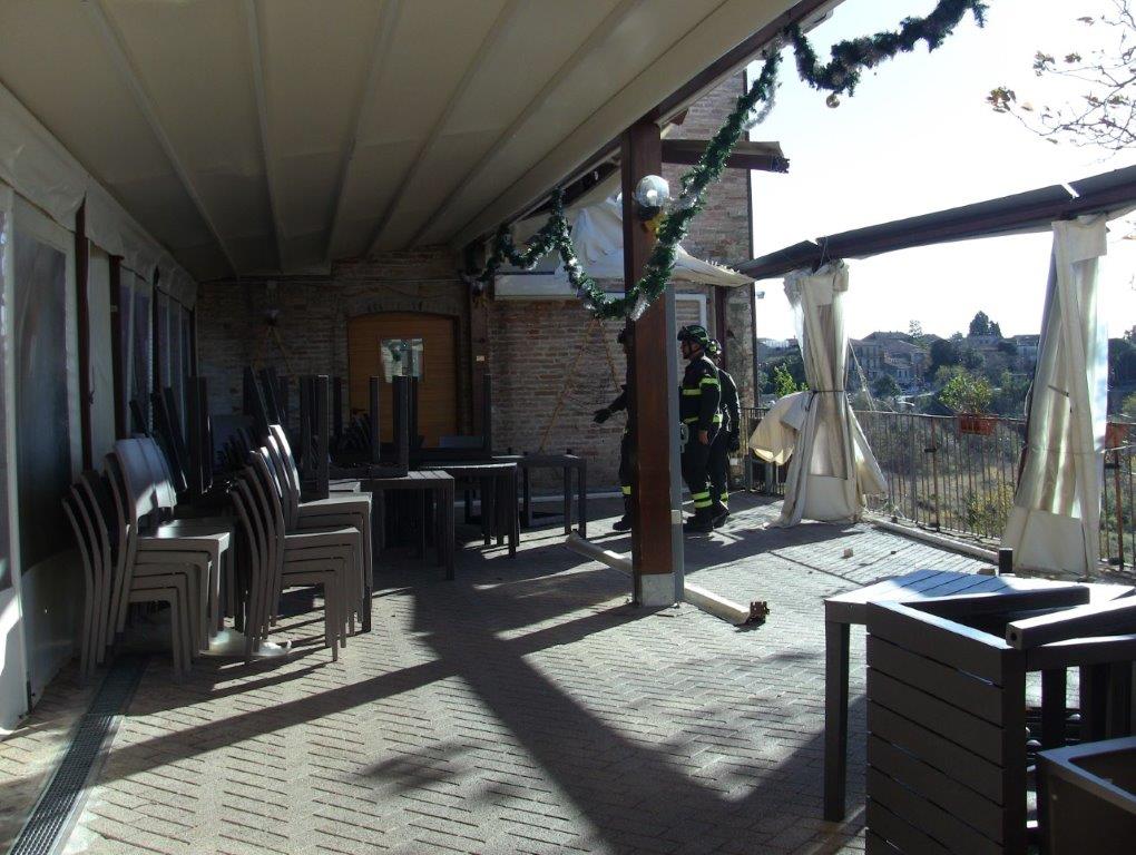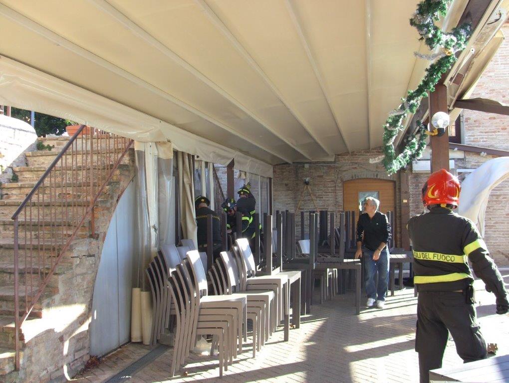 È stato necessario l’intervento dei Vigili del Fuoco di Macerata per ripristinare un minimo di sicurezza impendendo che il vento completasse l’opera di demolizione del grande gazebo esterno. Un danno immenso per il gestore del ristorante che avrebbe dovuto riaprire il locale il 7 dicembre prossimo.