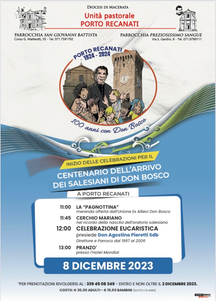 Quest’anno per la famiglia salesiana di Porto Recanati questa ricorrenza assume un significato ancora più speciale: i Salesiani Cooperatori, gli Ex-allievi di Don Bosco e il Gruppo Missionario daranno infatti il via proprio in questo giorno alle celebrazioni per i 100 anni dall’arrivo dei sacerdoti salesiani in città, che avvenne nella primavera del 1924.