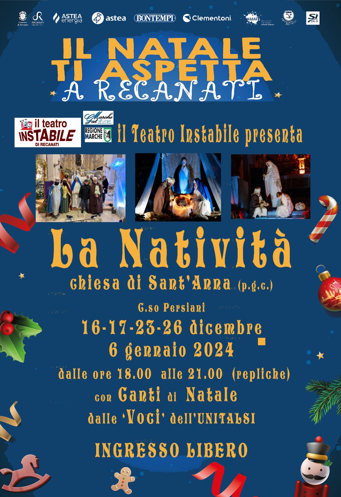 Ha riscosso successo l’iniziativa, per il secondo anno consecutivo, della rappresentazione con luci, musica e con il coro dell’Unitalsi della Natività a cura della compagnia del Teatro Instabile di Recanati nella chiesa di Sant’Anna in Corso Persiani. L’evento è originale per la scelta degli attori di non recitare ma di muoversi sotto effetti speciali di luci e suoni creando una atmosfera unica e suggestiva. I prossimi appuntamenti sono in programma nei giorni 23 e 26 dicembre e 6 gennaio alle ore 18 e alle ore 21.