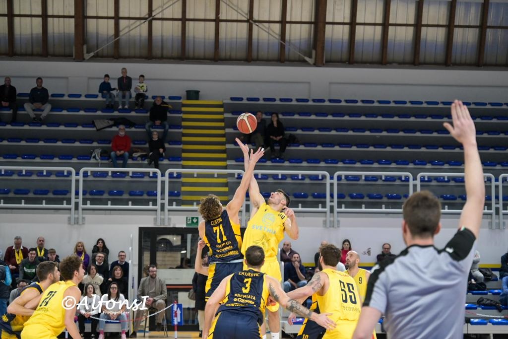 RECANATI – Una Svethia solida e pratica si regala un Natale meraviglioso e trova sotto l’albero altri due punti importantissimi in ottica vetta della classifica. Al PalaCingolani-Pierini non è andata in scena la versione gialloblu più sfavillante ma poco importa perchè certe stagioni passano anche da serate come questa dove quello che conta è portare a casa la pagnotta. Dopo un avvio che assomiglia ad una gara del tiro da tre con le triple di Contini e Gasparini da una parte e Pozzetti ed Andreani dall’altra, i leopardiani scappano sul 13-6 grazie alla conclusione pesante di Gurini. Il time out di coach Coen non dà i frutti sperati, le bombe di Andreani e Clementoni insieme a due punti di Sabbatini chiudono il quarto sul 25-15. Il match scade di qualità nel secondo periodo quando l’attacco di casa perde la verve dei primi dieci minuti ma grazie alla solidità difensiva mantiene la Sutor a distanza di sicurezza. All’intervallo Svethia avanti di 9 (37-28). Al ritorno dagli spogliatoi Montegranaro arriva a -7 (41-34 con tripla di Nessi). Qualche discutibile fischio arbitrale finisce per indispettire i padroni di casa: un antisportivo a Clementoni ed un tecnico ad Andreani accendono il match, lo stesso Clementoni ricaccia la Svethia a +12 (46-34) ma è Merlini sponda Sutor a tenere viva la fiammella della speranza. Al 30′ Recanati avanti 53-42. Serve però un ultimo sforzo per raggiungere la quindicesima vittoria consecutiva ed arriva dalla difesa: soltanto 8 i punti concessi ad una Sutor che si smarrisce complice il parziale di 11-3 col quale si apre l’ultimo quarto. Clementoni due volte dalla linea dei 6.75 più due punti da sotto di Sabbatini e Recanati che vola a +19 (64-45). C’è spazio anche per il secondo discutibilissimo tecnico ad Andreani che rischia di avvelenare un match che non ha più niente da dire. Finisce 66-50 con il PalaCingolani-Pierini tutto in piedi a celebrare una squadra che si regala un Natale da sogno.