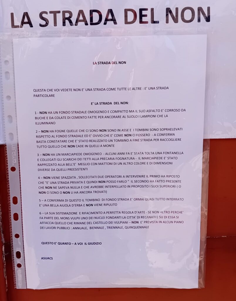 Capisco il disappunto dei residenti, anche se leggo che uno di loro ha aggiunto un “NON”, ma questo loro disagio è uguale o tutt’al più simile a quello di altri Recanatesi, che pur pagando le profumate tasse, si sono dovuti fare a loro spese le fogne, l’asfalto e l’illuminazione.
