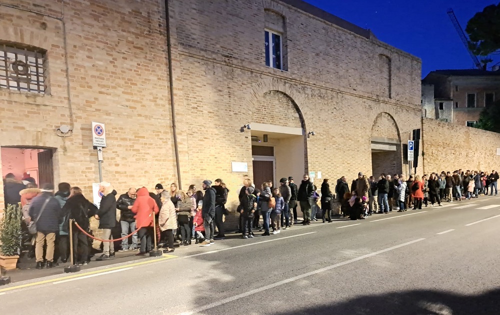 visitatori in attesa per ammirare il presepe di Leandro Messi