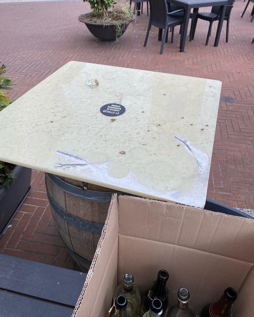 “Si ringraziano gli educatissimi (teste..….) – scrive il titolare su facebook – che la sera del 31 hanno utilizzato il nostro tavolo per i festeggiamenti, usandolo come ripiano per gli spari, creando danni permanenti con tanto di vetro lasciato lì. Possiamo dire che questo 2024 è iniziato all’insegna del rispetto”.