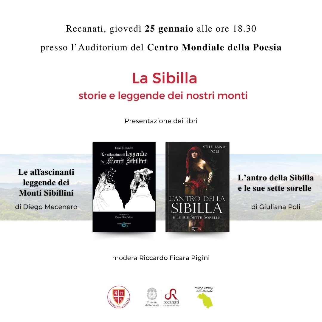 Giovedì 25 alle 18.30 all’Auditorium del Centro Mondiale della Poesia di Recanati tornano gli eventi culturali organizzati da Iustissima Civitas. In questa occasione gli ospiti saranno due scrittori molto noti per i loro scritti e gli studi sulla Sibilla e le leggende dei Monti Sibillini: verranno infatti presentati i libri “Le affascinanti leggende dei Monti Sibillini” di Diego Mecenero e “L’antro della Sibilla e le sue sette sorelle” di Giuliana Poli.