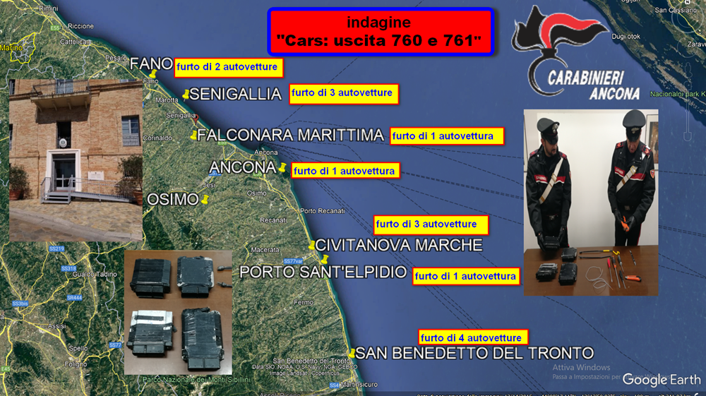 Riscontro importante si è avuto, poi, quando, la notte del 24 ottobre u.s., i Carabinieri del NORM di Osimo hanno seguito l’auto con a bordo gli odierni indagati fino a Fano (PU), dove, grazie al contributo fornito dalla locale Compagnia, la compagine è stata fermata e trovata in possesso di 4 centraline per autovetture e di attrezzi creati appositamente per l’apertura dei veicoli.