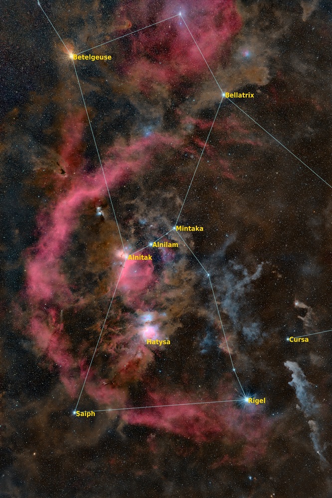 Orione, il Cacciatore, la supergigante rossa Betelgeuse, in alto a sinistra, svetta in una forte tonalità arancione. Numerose le stelle blu della costellazione, con la supergigante Rigel in basso a destra e Bellatrix in alto a destra. Nella cintura di Orione, si distinguono allineate le sue tre stelle – Alnitak, Alnilam e Mintaka – tutte distanti circa 1500 anni luce, nate dalle nubi interstellari. Appena sotto la cintura di Orione si trova una macchia luminosa e sfuocata, nota come Nebulosa di Orione. Infine, appena visibile a occhio nudo, l’Anello di Barnard: un’enorme nebulosa a emissione gassosa che circonda la cintura e la Nebulosa di Orione.