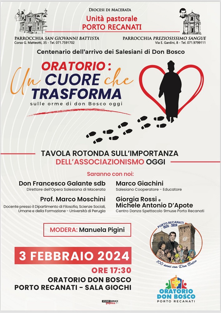 Gli eventi per celebrare il Centenario dell’arrivo dei Salesiani di Don Bosco a Porto Recanati proseguono il prossimo fine settimana: sabato 3 febbraio si terrà una tavola rotonda sull’importanza dell’associazionismo dal titolo “Oratorio: un cuore che trasforma sulle orme di don Bosco oggi”.
