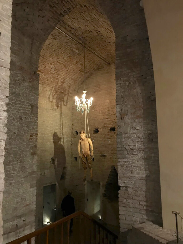 La Rocca Sforzesca racchiude l’ultima tappa dell’esposizione imolese, ed è una suprema conclusione per rappresentare la Fine! Il corpo di un giovane fauno suicida pende nel vuoto da un fastoso lampadario antico mentre esala l’ultimo respiro. “La morte dell’eros”, titolo dell’installazione, mette in scena il suicidio di Pan, il dio legato alla potenza della Natura e della forza vitale. Il progetto, nato nel 2000 da una visione di Casoni, è un’elaborazione durata per anni a fasi alterne, portata a termine da Bertozzi. L’opera porta ad una riflessione sul mondo di oggi, indebolito e malato. Una volta presa coscienza di questo, il dio s’impicca su un lampadario in totale solitudine all’interno delle mura di una fortezza, lontano dal quel mondo naturale che ha sempre protetto. Ma ad ogni fine c’è sempre un nuovo inizio…