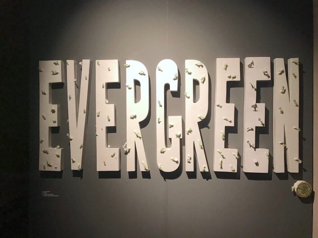 La moneta della Banca di Oklahoma chiamata Brunello, progettata come un bersaglio a cerchi concentrici bianchi e neri, diventa un marchio identitario declinato in diverse opere come in Evergreen dove viene posto a lato dell’opera come firma degli artisti a chiudere la serie delle imponenti lettere che formano la parola.