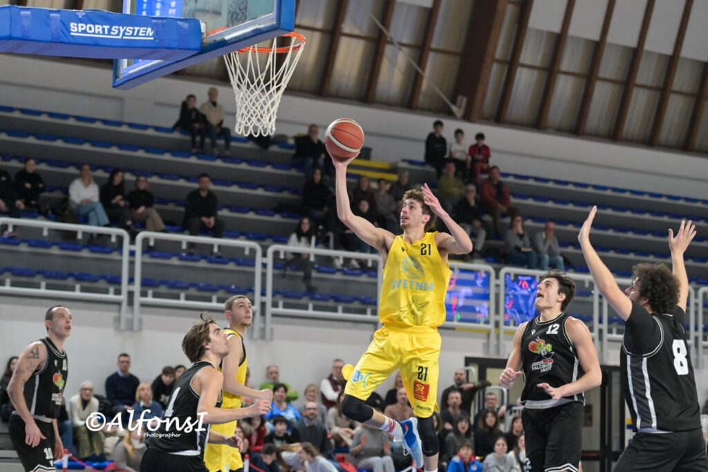 RECANATI – Una Svethia dai due volti porta a casa la vittoria numero ventidue e si prepara al meglio in vista del big-match di domenica al PalaBellini di Osimo contro la Robur. Gialloblu privi di Pozzetti, impacciati e poco precisi nei primi dieci minuti, Falconara ne approfitta grazie alla vena realizzativa di Filippo Centanni che con due triple consecutive porta i suoi sul +9 (5-14). Curzi firma il +11 (5-16) mentre è Ndzie a riportare lo svantaggio sotto la doppia cifra (7-16). Apertura di secondo quarto con Recanati ancora in difficoltà: Pajola e Curzi spingono i bianconeri addirittura a +15 (7-22), coach Di Chiara striglia i suoi e la partita cambia all’improvviso. Sotto le plance si scatena Reimundo, dalla panchina si alza un caldissimo Clementoni ed in un amen i gialloblu con un parziale di 17-2 raggiungono la parità (24-24 al 20′).