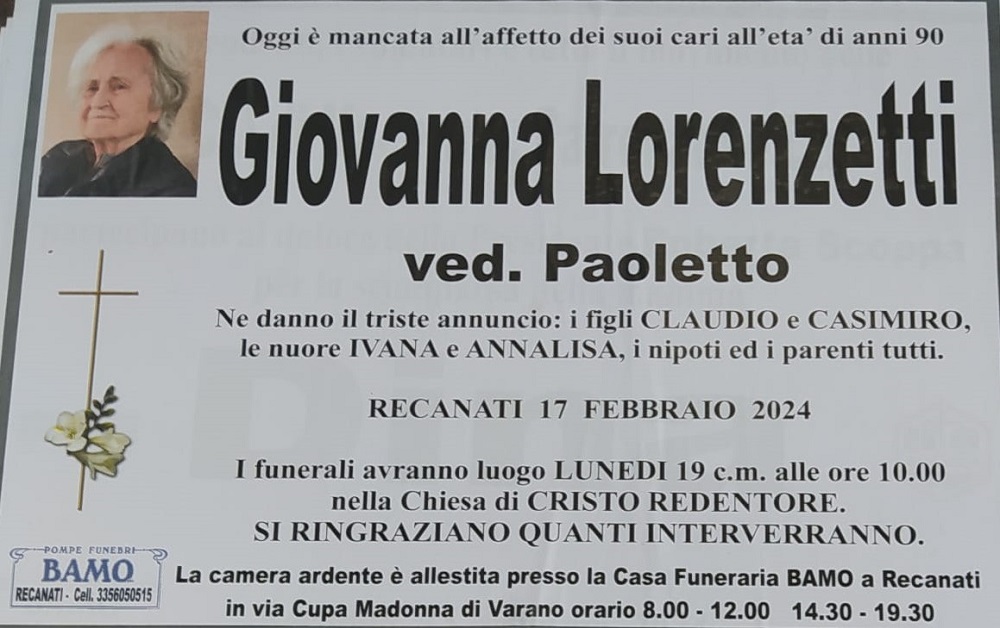 E’ morta Giovanna Lorenzetti ved. Paoletto