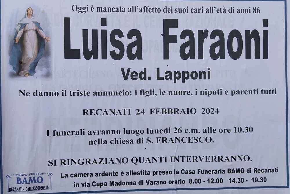 E’ morta Luisa Faraoni ved. Lapponi