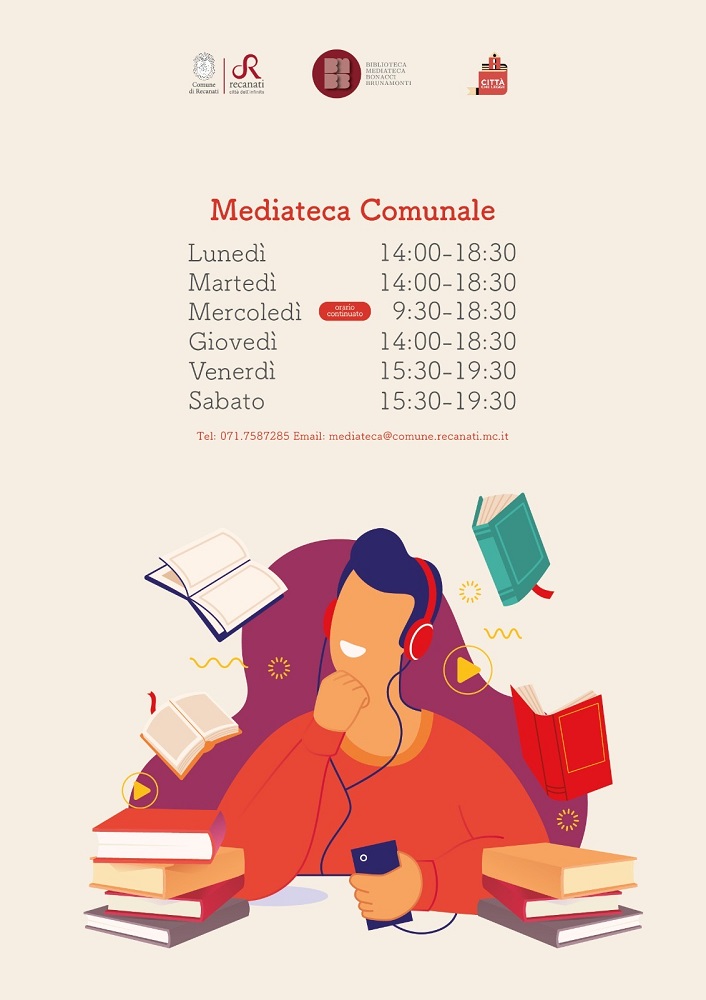 La Mediateca sarà aperta il lunedì e martedì dalle ore 14 alle ore 18,30; il mercoledì dalle ore 9 alle ore 18,30 orario continuato; il giovedì dalle 14 alle 18,30 il venerdì e sabato dalle ore 15,30 alle 19,30