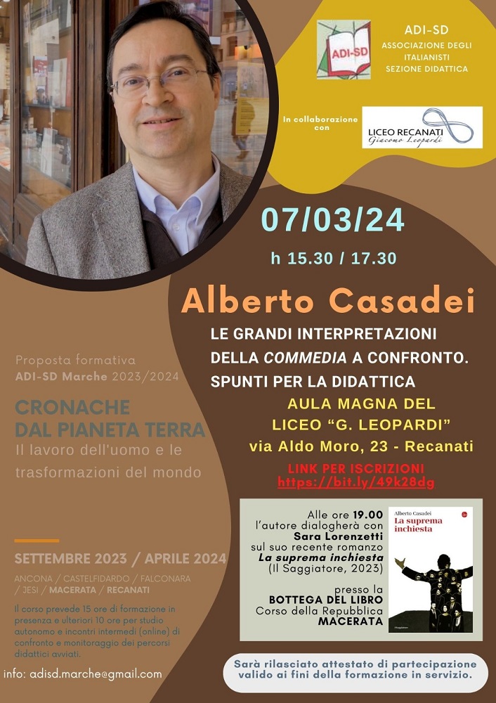 L’associazione degli italianisti – sezione didattica delle Marche celebra il Dantedì 2024 con un ospite d’eccezione come Alberto Casadei, ordinario presso l’Università degli Studi di Pisa e esimio studioso del Poeta, a cui ha dedicato un numero ragguardevole di pubblicazioni: il 7 marzo ore 15.30 presso il Liceo “Leopardi” di Recanati il professore terrà una conferenza sulle più aggiornate interpretazioni critiche della Commedia, su cui rifletterà anche in prospettiva didattica. L’evento è rivolto agli studenti e ai docenti, per i quali sarà valido ai fini della formazione in servizio (ci si può iscrivere all’incontro al seguente link https://bit.ly/49k28dg).