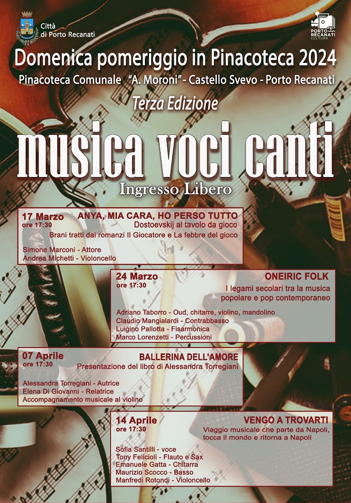 Domenica 17 marzo, con il primo dei quattro appuntamenti in calendario, prenderà il via la terza edizione della rassegna “Musica, voci, canti” promossa dall’Assessorato alla Cultura della Città di Porto Recanati.