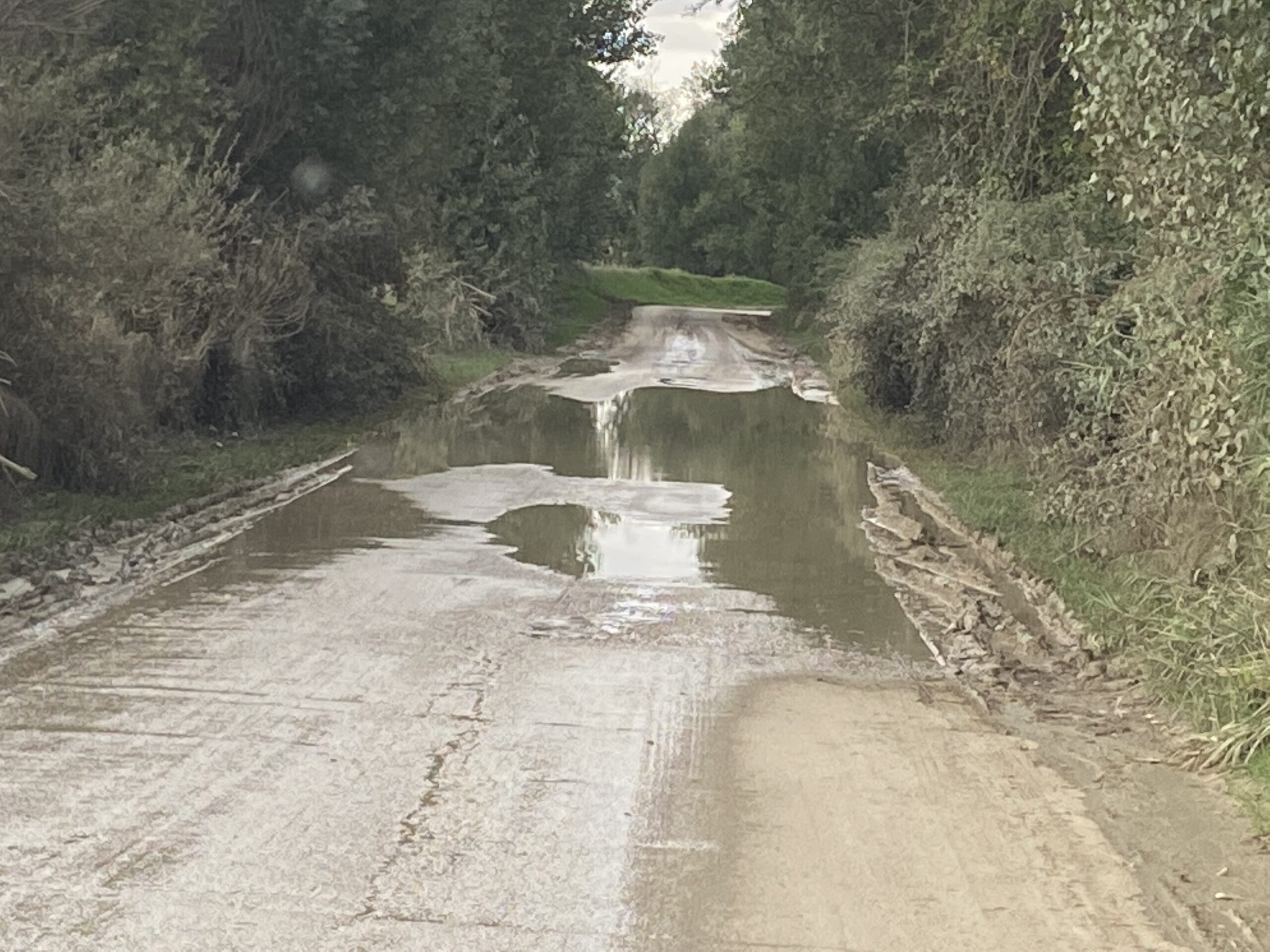 A parte le numerose buche presenti sull’asfalto, a metà del suo percorso si trova quasi sempre un tratto completamente coperto, per tutta la larghezza della carreggiata, da una vasca d’acqua che rende totalmente invisibile la pavimentazione con tutte le sue insidie costituite da veri crateri che mettono a dura prova i veicoli in transito. La stagnazione di acqua piovana è dovuta all’avvallamento della strada e alla mancanza di un fosso che consentirebbe di far defluire l’acqua piovana verso il fiume che dista solo pochi metri di distanza.