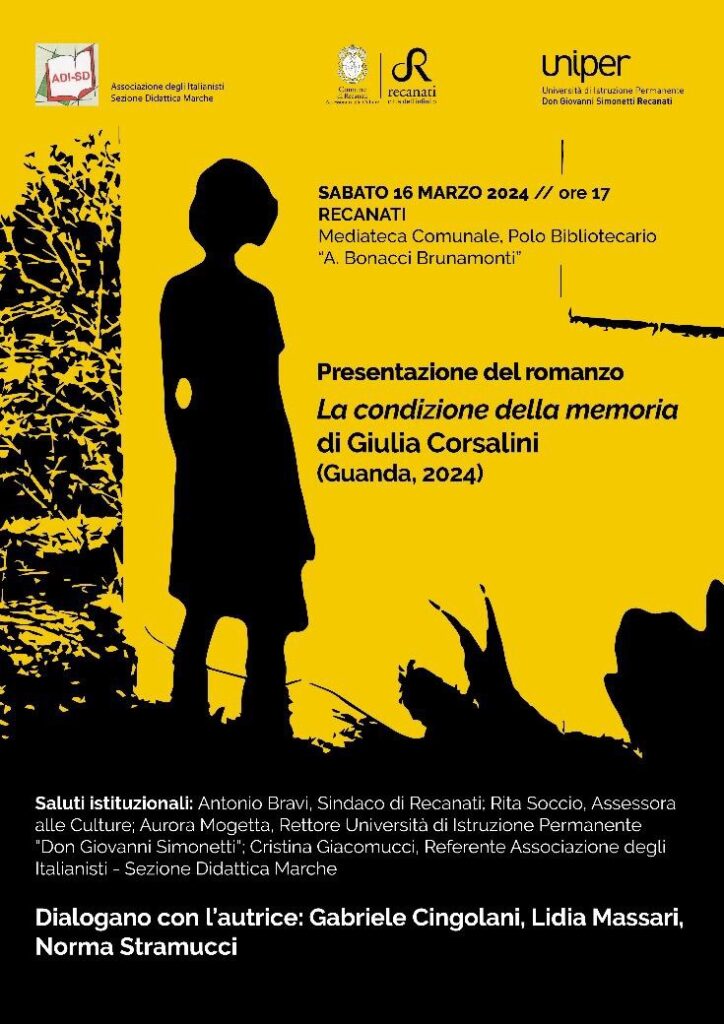Sabato 16 marzo 2024, alle ore 17.00, presso la Mediateca Comunale di Recanati, verrà presentato il nuovo romanzo della scrittrice recanatese Giulia Corsalini, intitolato La condizione della memoria e pubblicato poche settimane fa dalla casa editrice Guanda. L’incontro è organizzato dal Comune di Recanati, dall’Università di Istruzione Permanente “Don Giovanni Simonetti” e dalla sede marchigiana dell’Associazione degli Italianisti – Sezione Didattica, con la quale Corsalini ha collaborato attivamente per molti anni.