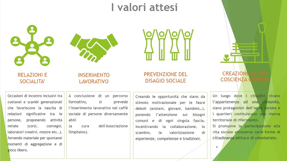 Il Progetto, che soddisfa tutti i requisiti richiesti dal PNRR (Progetti di rigenerazione urbana, volti a ridurre situazioni di emarginazione e degrado sociale) risponde all’esigenza di creare un punto di incontro, accoglienza ed inclusione, per tutte le realtà presenti nel quartiere e nel territorio.