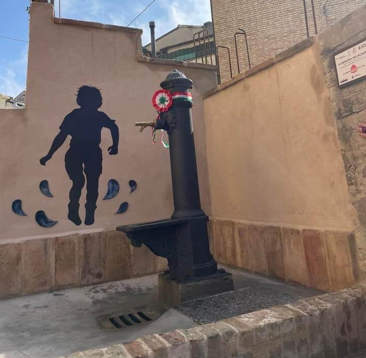 Poi, in compagnia del Sindaco, la visita in corteo alle fontanelle. Le voci dei bambini e bambine e la loro gioia sparsa per i vicoli hanno illuminato il cuore del rione. Un percorso dell’acqua pubblica inteso come bene primario ma anche come attrazione turistica per gli interventi artistici sia con i lavori in ceramica di Piera Marconi, alcuni ispirati alle poesie di Maria Alinda Bonacci Brunamonti e Garcia Lorca, sia dai murales eseguiti da Dario Bazan (Piaggia) e Nikla Cingolani (Porta Cannella): ombre fissate sui muri come impronte che immortalano l’immagine di un’assenza ed evocano presenze in rapporto tra memoria individuale e memoria collettiva.