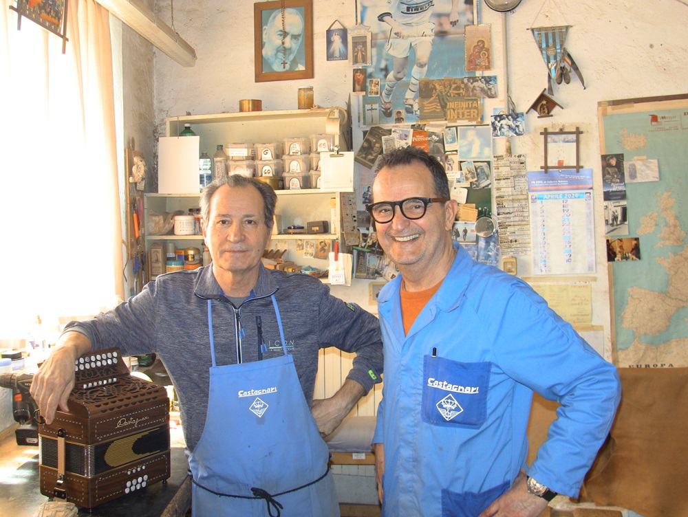 Patron di questa antica arte l’intera famiglia Castagnari: la loro arte è nata con il nonno Giacomo nel 1914 in questa stessa bottega. Dalle fisarmoniche sono passati agli organetti dopo aver conosciuto un francese appassionato di questo strumento musicale e da allora, dagli anni ottanta saranno stati costruiti circa 30.000 organetti spediti per la maggior parte all’estero.