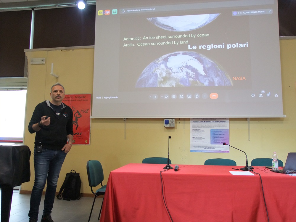 Conoscere il passato, interpretare il presente e progettare il futuro. Il motto del Programma Nazionale di Ricerche in Antartide riassume perfettamente l’essenza dell’incontro che si è svolto nella mattinata dell’ 8 aprile 2024, presso l’Aula Magna del Liceo G. Leopardi di Recanati fra tanti studenti- in presenza e online-, l’ingegnere Rocco Ascione (Unità Tecnica Antartica dell’ENEA) e lo station leader del “gruppo degli invernauti” in Antartide, Gabriele Carugati.