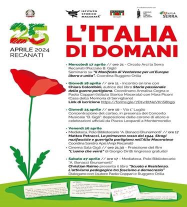 Venerdì 26 aprile alla mediateca del polo bibliotecario “Bonacci Brunamonti” alle ore 17 si terrà l’incontro coordinato da Sandro Apis dell’Anpi Recanati con Matteo Petracci “la primavera rossa del 1944 Stragi nazifasciste e guerriglia partigiana nell’alto maceratese” e alle ore 21,30 nella Sala Gigli ad ingresso gratuito è prevista la proiezione del fil “L’uomo che verrà “ di Giorgio Diritti.