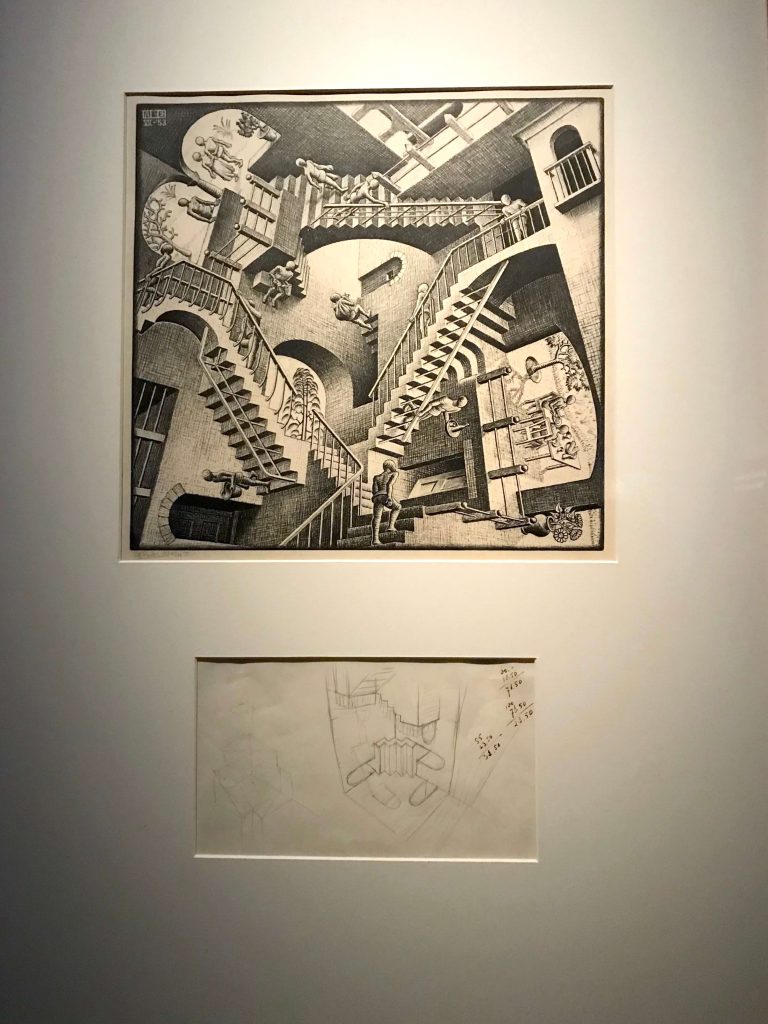 Nato in un’epoca in cui i computer non esistevano e neppure i social così come l’intelligenza artificiale, ha creato opere con principi scientifici che non poteva conoscere. Capolavori come Salire e Scendere, Belvedere, Cascata, Galleria di stampe, o ancora Relatività, opera certamente influenzata da Giovanbattista Piranesi (1720-1778), l’artista architetto di cui fu collezionista e che ci ha lasciato la raccolta di incisioni Le Carceri D’Invenzione, riflettono due aspetti essenziali dell’arte del grafico olandese: la sua sublime abilità nel disegno nel creare immagini affascinanti senza sbavature, e il suo complesso rapporto con la matematica, la geometria e il tema della riproduzione grafica dell’infinito.