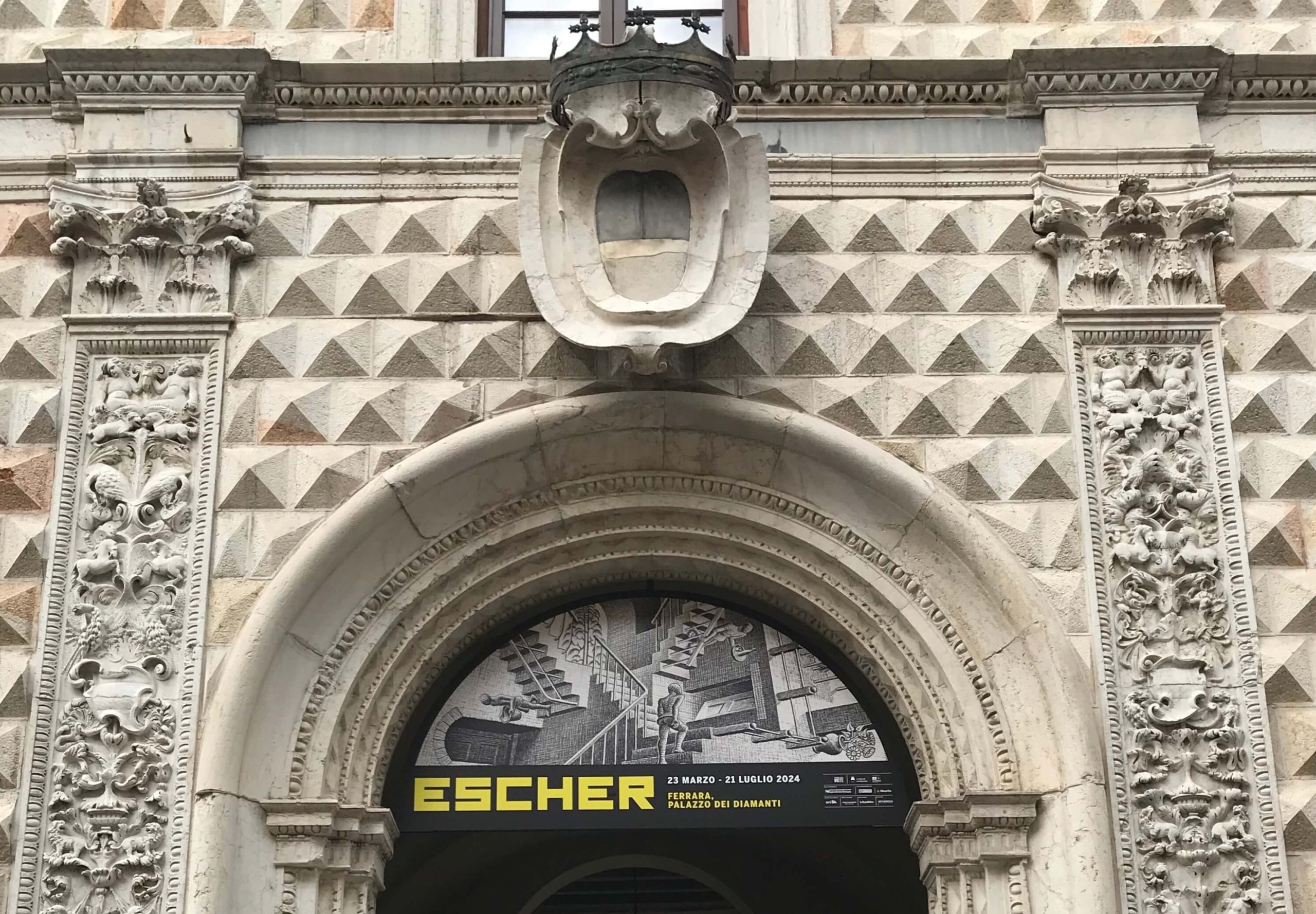 Non si poteva scegliere sede migliore per mostrare i capolavori di M.C. Escher, l’artista olandese visionario e anti-convenzionale, noto per le sue rappresentazioni di paradossi matematici, prospettive apparentemente impossibili e immagini stranianti, che mettono in discussione l’idea comune di spazio. Ossessionato dalla geometria e dalle ripetizioni matematiche infinite, è nel Palazzo dei Diamanti, uno dei monumenti più celebri di Ferrara e del Rinascimento italiano, che la mostra trova la perfetta connessione a partire dal bugnato della facciata dall’effetto prospettico sorprendente. Peccato che nel suo breve passaggio nella città Estense, diretto verso Venezia, non si sia spinto oltre la Cattedrale di San Giorgio. Di sicuro sarebbe rimasto affascinato dalla trama visiva creata dalla fitta ripetizione dello stesso elemento.