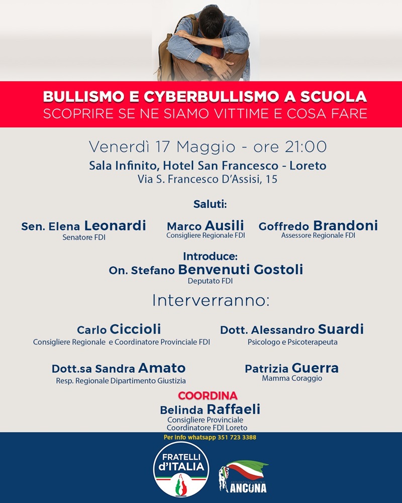 Questo pericoloso fenomeno sociale, sempre più diffuso e di grande attualità, è il tema che Fratelli d’Italia affronterà nel convegno organizzato e coordinato dalla segretaria del circolo cittadino dott.ssa Belinda Raffaeli da sempre impegnata in argomenti ad alto impatto sociale, presso l’Hotel San Francesco a Loreto, nell’ambito delle attività di prevenzione e contrasto svolte dal Dipartimento per le Politiche della Famiglia della Presidenza del Consiglio.