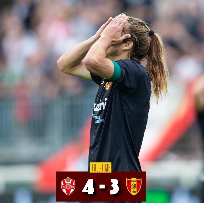 La Recanatese retrocede in serie D tra lacrime, rimpianti e proteste per la direzione di gara. Al Benelli di Pesaro si è giocata una partita al cardiopalma che i padroni di casa hanno vinto all’ultimo respiro con il punteggio di 4 a 3. Anche se il conteggio finale è di parità alla luce del successo dei leopardiani all’andata per 1 a 0, la Vis si salva grazie al miglior piazzamento in classifica ottenuto al termine della regolar season. Due miseri punti di differenza che alla fine hanno contato e tantissimo in una doppia sfida play out che si è sostanzialmente giocata sui binari dell’equilibrio e che si è decisa negli otto minuti di recupero concessi dal direttore di gara in cui i pesaresi hanno trovato il gol salvezza con Pucciarelli. La Recanatese è andata vicinissima all’impresa trascinata dal suo capitano che per ben tre volte è riuscito a riacciuffare la Vis. Ma la verve di Sbaffo non è stata sufficiente per mantenere il professonismo. Si ritorna nei dilettanti a due anni esatti dalla promozione in C. Palpabile la delusione tra i tanti tifosi che hanno raggiunto il Tonino Benelli assistendo ad un’autentica altalena di emozioni.