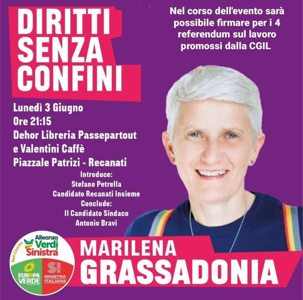 “Diritti senza confini” è lo slogan scelto da Marilena Grassadonia per la campagna elettorale delle europee 2024. L’attivista lgbt+, componente della Direzione e della Segreteria nazionale di Sinistra Italiana, lunedì 3 giugno sarà a Recanati per un incontro a sostegno della rielezione a sindaco di Antonio Bravi.