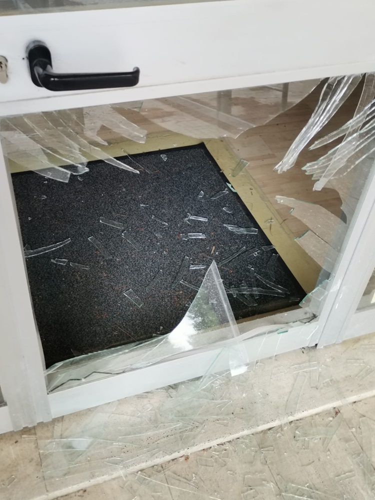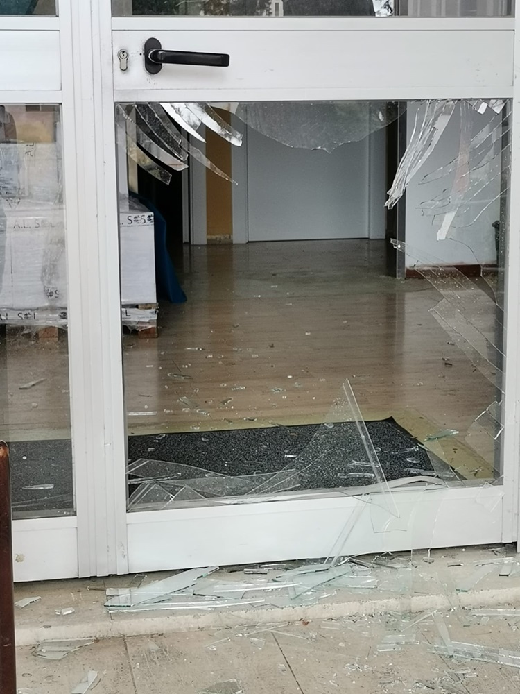 dall’Amministrazione comunale, è stata oggetto l’altra notte e ieri, subito dopo l’ora di pranzo, di un atto vandalico che ha distrutto la vetrata della porta d’ingresso.