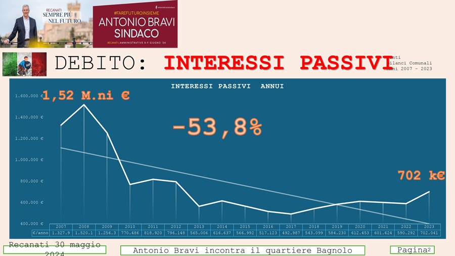 -70 Attività commerciali/negozi in centro storico, hanno chiuso. Imposte comunali più alte d’Italia, parcheggio più costosi delle Marche, servizi al cittadino più costosi e ridotti, uffici comunali chiusi il sabato o con orario ridotto negli altri giorni della settimana per risparmiare. Mancanza di personale comunale non assumibile per mancanza di soldi. Ecco come il sindaco uscente Bravi e la sua cricca hanno amministrato in questi 15 anni, solo facendo i loro interessi… E non avete il coraggio di ammettere e dire cosa lasciate da pagare per i prossimi 25 anni…non c’interessa il vecchio, nel comunicato sopra ci sono due grafici che non dicono nulla perché non fanno parte di documenti ufficiali come invece quello pubblicato dal consigliere Mariani che è un documento ufficiale pubblicato del Comune. Dovete avere il coraggio di dire cosa lasciate da pagare ai nostri figli, ai nostri nipoti! Oggettivamente, dai dati, risultati ed situazioni di fatto non sembra che il sindaco Bravi, che dovrebbe saper leggere un bilancio( ma non è il solo) ma poi dovrebbe essere anche in grado di aministrare che sono due cose diverse. Non ha creato benessere per i recanatesi…Anzi c’ha imbuffato per 25 anni! E’ facile amministrare a debito lasciando poi da pagare a chi viene dopo…