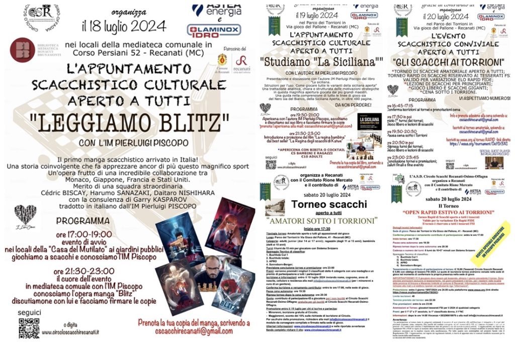 Vi aspettiamo numerosi ai tre giorni del Circolo Scacchi Recanati-Osimo-Offagna con l’IM Piscopo Pierluigi che, oltre a presentare e firmare alcuni suoi libri (il primo manga scacchistico in italiano e il manuale dell’apertura chiamata Siciliana), ci onorerà giocando con noi anche in un torneo RAPID a variazione ELO (punteggio che misura la forza di gioco negli scacchi), che ha già diversi iscritti.
