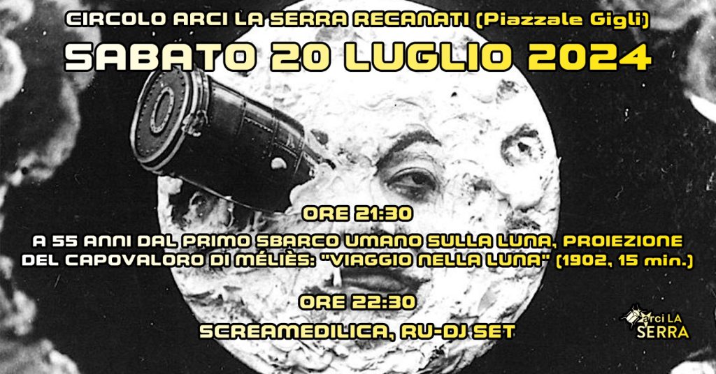 A 55 anni dal primo sbarco umano sulla Luna, avvenuto nel luglio del 1969, il Circolo ARCI LA Serra di Recanati, aderente al circuito UCCA, ricorda quest’anniversario con un cineforum ( evento Fb: https://www.facebook.com/share/SKHgoSEhUzjYXj83/ ).