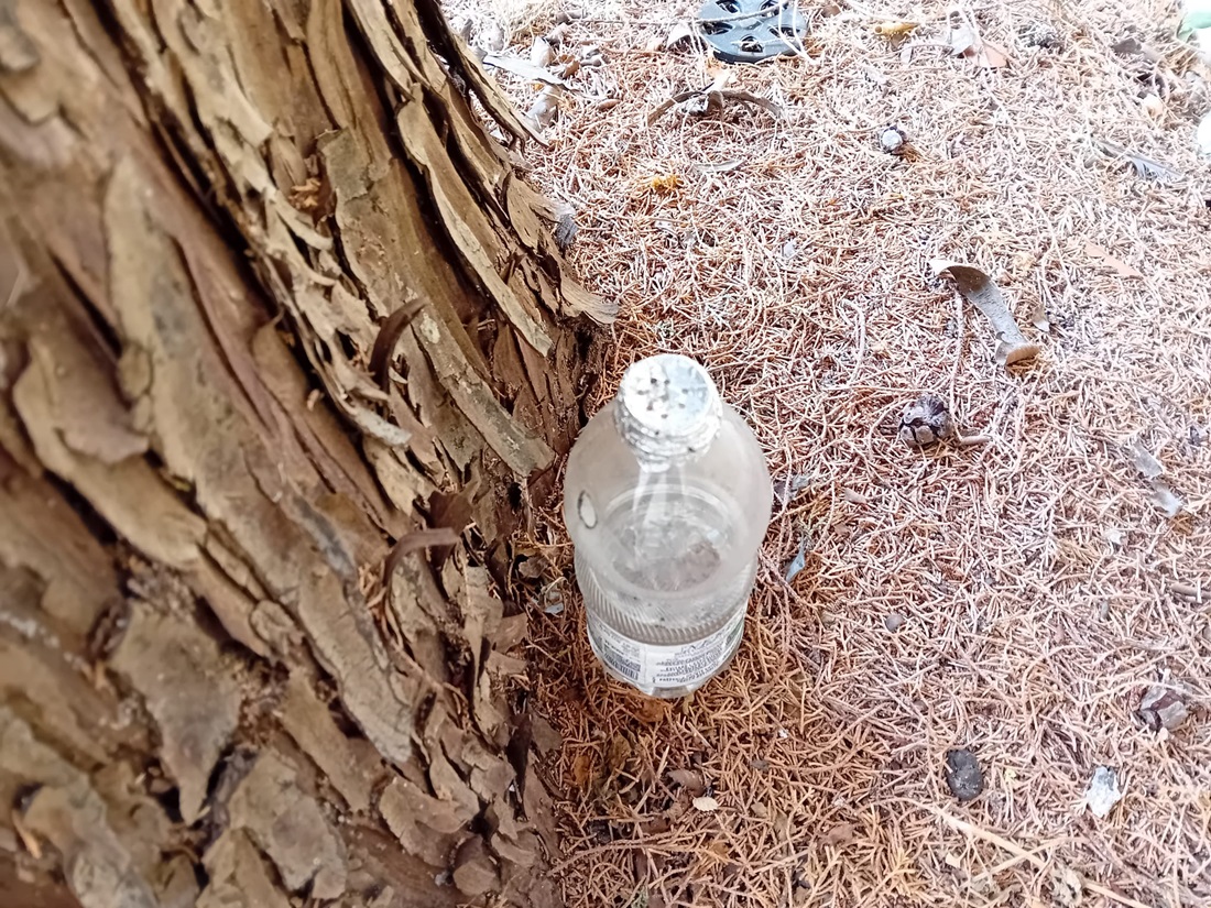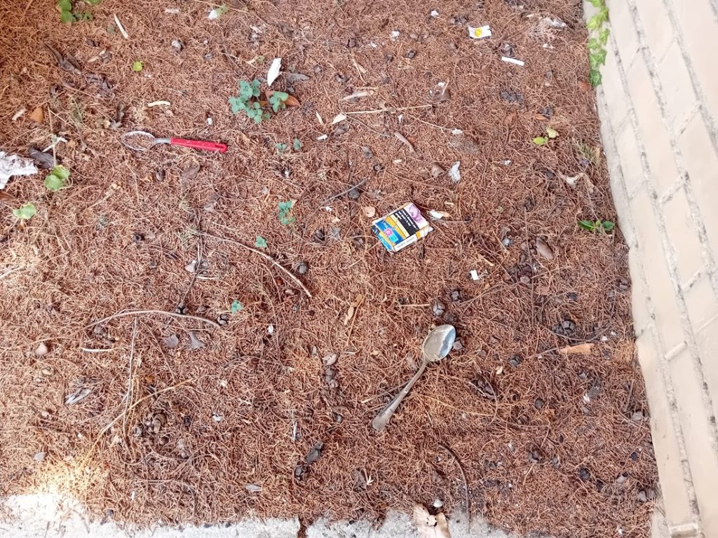 Dietro la pianta c’è una bottiglietta riempita a metà con acqua e, al posto del tappo, un pezzo di carta stagnola forato: classica preparazione per inalare nei polmoni la droga. A terra, poco distante, due cucchiai anch’essi utili per la preparazione della droga.