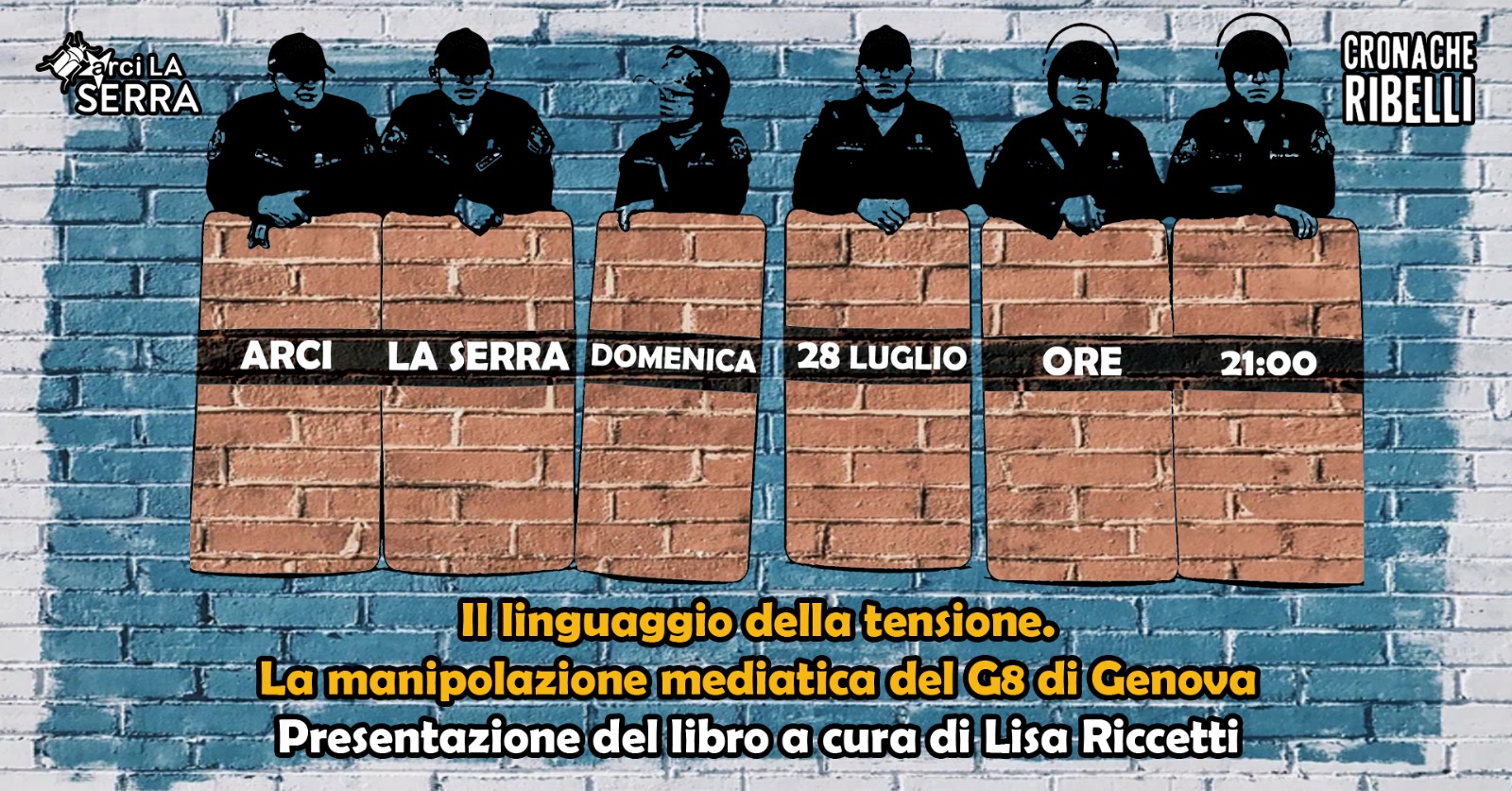 Vi aspettiamo domenica 28 luglio al circolo, dalle 20 con aperitivo e alle 21 con l’autrice Lisa Riccetti per la presentazione del libro “Il linguaggio della tensione” (edizioni @cronacheribelli), per parlare della manipolazione mediatica dei fatti intorno al G8 del 2001, anche in relazione alle forme di repressione che vive quotidianamente chi si occupa di lotte sociali in Italia. Sarà presente un banchetto con copie del libro.