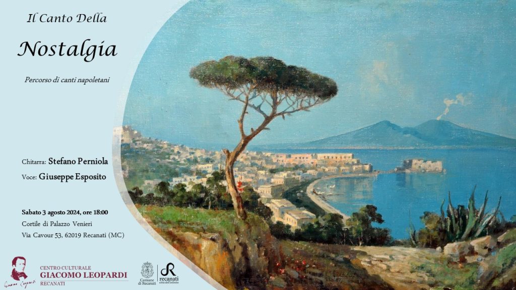 Il Centro Culturale Giacomo Leopardi di Recanati per sabato 3 agosto 2024 alle ore 18, nella location del cortile di Palazzo Venieri, in centro città a Recanati propone Il canto della nostalgia, un recital di significativi canti napoletani interpretati dalla voce di Giuseppe Esposito ed accompagnati alla chitarra dal maestro Stefano Perniola.