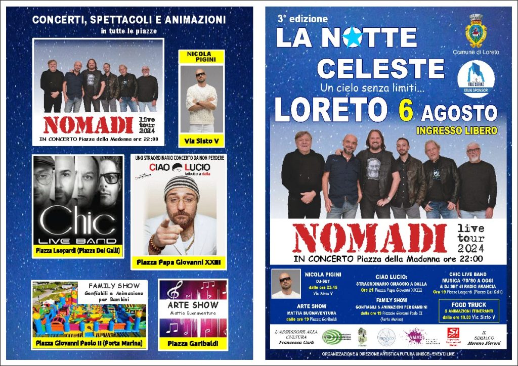 La manifestazione, ad ingresso libero, inizierà a partire dalle 19.00 con food truck e animazioni itineranti e si protrarrà fino all’una circa. Tra le proposte musicali spiccano, anche quest’anno, il Dj-Set di Nicola Pigini, in via Sisto V, ‘Ciao Lucio: straordinario omaggio a Dalla’ in Piazza Papa Giovanni XXIII, Family Show per i più piccoli in Piazza Giovanni Paolo II, Arte Show di Mattia Buonaventura in Piazza Garibaldi e gli Chic Live Band in Piazza Leopardi. Di assoluto impatto l’allestimento pensato per l’occasione: l’intero centro storico sarà ‘colorato’ di celeste, grazie a luminarie ed addobbi studiati ad hoc. Coinvolti anche i commercianti, che esporranno nelle vetrine dei negozi decorazioni celesti fornite da Confcommercio Marche Centrali. Un grande evento reso possibile anche grazie al sostegno di molti partner cittadini. Presenti questa mattina in conferenza stampa anche Nevio Russo, in rappresentanza di Futura Unisce – Eventi Live, che anche quest’anno è organizzatore del format. Anche per questa edizione il main sponsor sarà Loreto Multiservizi, supportata anche dalla Fondazione Opere Laiche, dalla Fondazione Carilo, dalla Pro Loco, Amat e Si con Te.