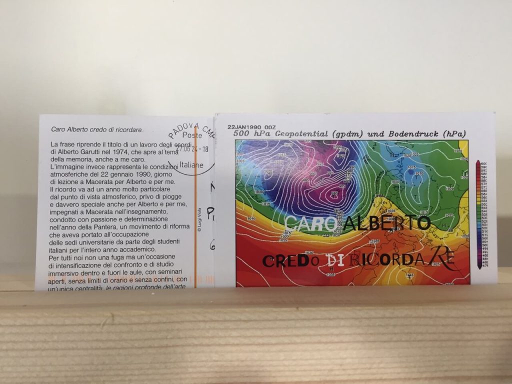 Dopo la scomparsa dell’artista avvenuta lo scorso anno, 165 persone tra ex studenti, amici, e artisti, si sono riunite in una chat dal suggestivo nome “Condominio Garutti” e, per ricordarlo, hanno avviato questa mostra con l’intento di dedicargli brevi testi, immagini, disegni, tramite l’invio di una o più cartoline postali.