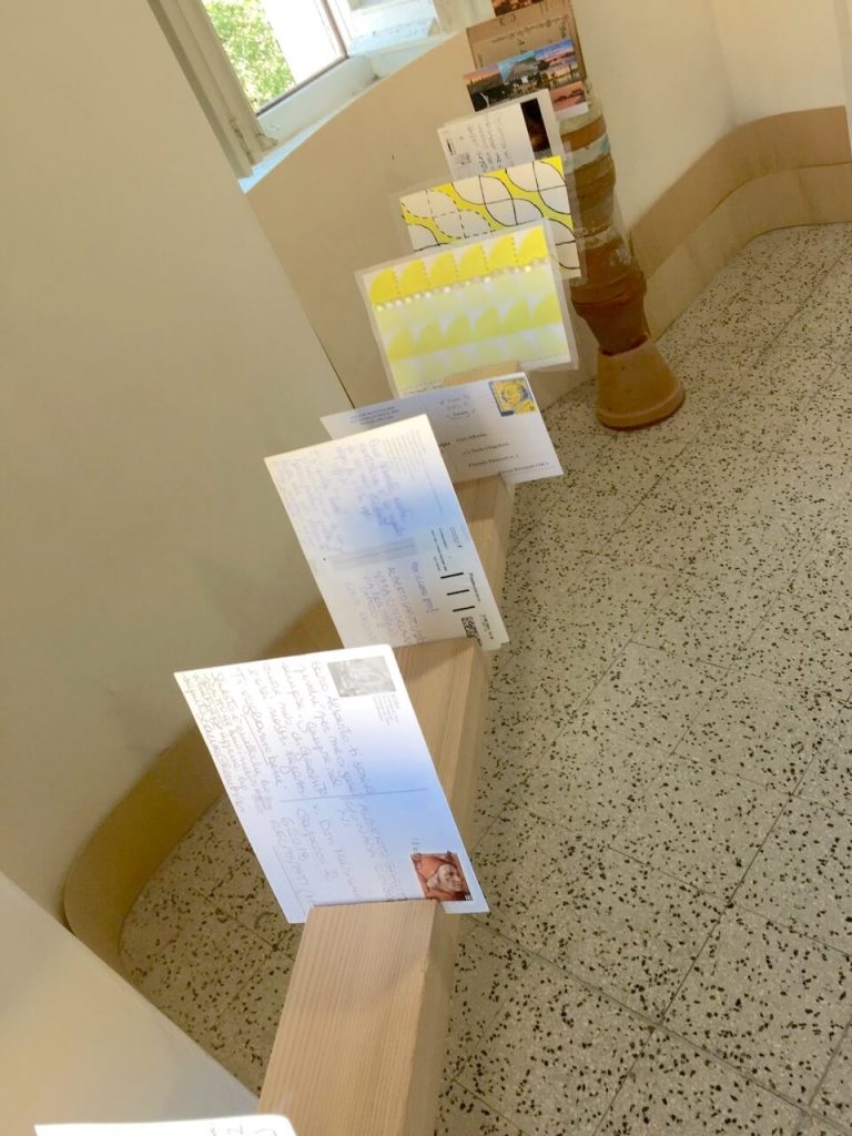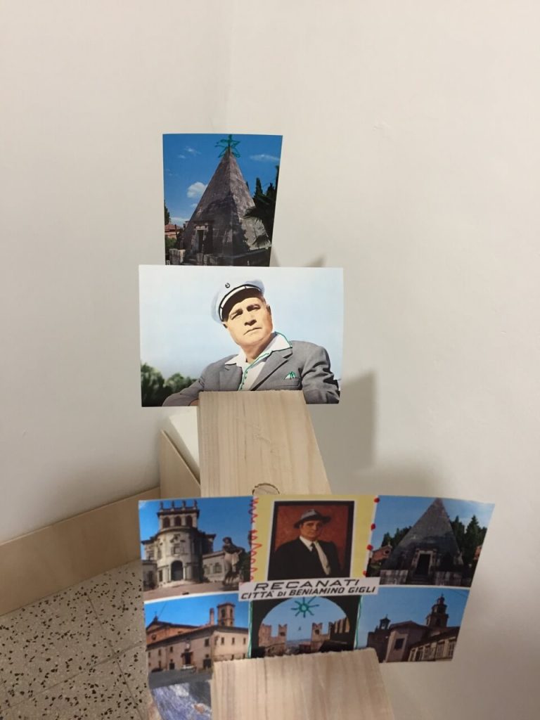 L’allestimento espositivo nella sua sobrietà comunica rigore e affetto sincero: le strutture sono semplici mensole a muro e stecche di legno intagliate per porre in risalto le cartoline le quali funzionano anche come linee di fuga che guidano lo sguardo verso le finestre con affaccio panoramico su Recanati. Le stecche sono sostenute da romantiche colonnine costruite con l’alternarsi di vasi in coccio da giardino, un elemento umile che non cattura l’attenzione ma rimanda altrove, alla metafora di una comunità che conserva in sé un tesoro prezioso come il ricordo del loro Maestro.