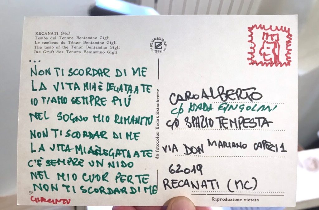 Giacinto Di Pietrantonio, abruzzese, curatore di mostre internazionali, critico d’arte, direttore alla GAMeC di Bergamo dal 2000 al 2017, docente di Storia dell’arte contemporanea presso l’Accademia di belle arti di Brera, giornalista, redattore capo e poi vicedirettore della rivista Flash Art dal 1986 al 1992, dagli Ottanta a oggi rappresenta una voce imprescindibile dell’arte contemporanea e del suo sistema. In una delle sue cartoline per “Caro Alberto”, rivolte a Beniamino Gigli, è dedicata al ricordo di quando con il suo amico artista, nei momenti di convivialità, cantava i versi delle canzoni più famose del tenore, Mamma e Non ti scordar di me.