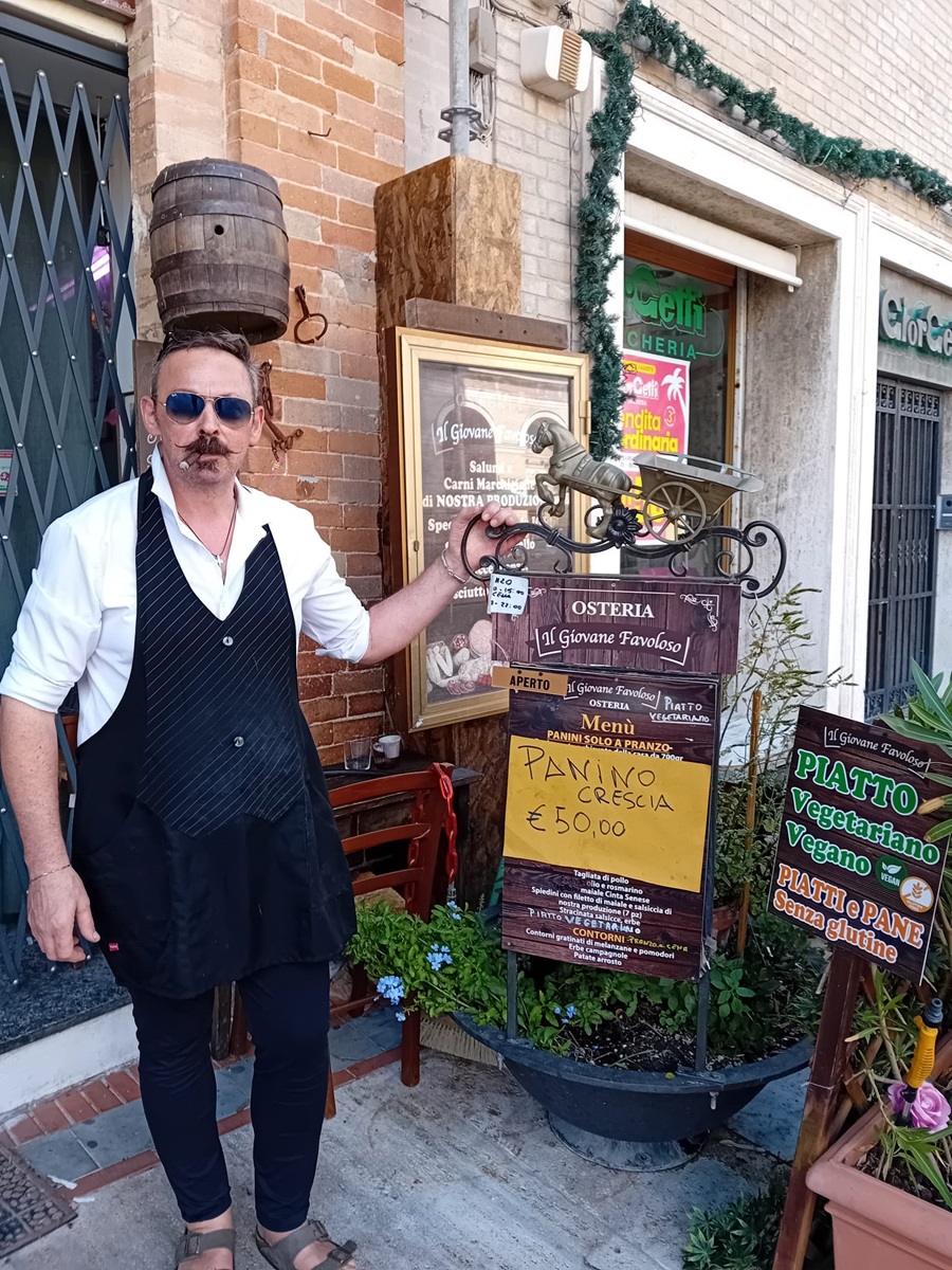 Ha sempre una buona dose di umorismo da spendere Giovanni Meriggi titolare del ristorante e macelleria di piazza Leopardi, “Giovanni il favoloso” Ieri sera, in occasione del concerto in piazza di Edoardo Bennato, il primo dei due appuntamenti di questa estate di Lunaria, per non essere distratto dal suo lavoro e concentrarsi al massimo sulla clientela del suo ristorante, con i tavoli, tutti da tempo prenotati, a pochi metri dal palco della concerto del noto cantautore, ha posto un cartello all’ingresso del suo locale in cui informa la clientela di passaggio che se vuole un panino si prepari a sborsare la bella cifra di 50 euro, a meno non si mangia neppure un sandwich.