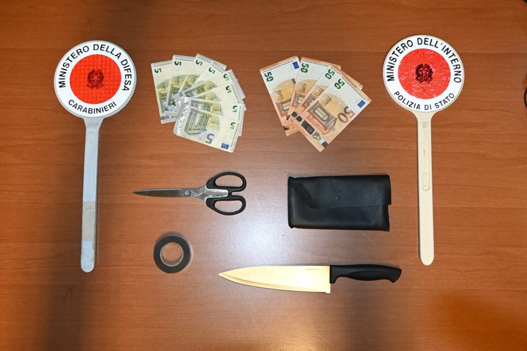 Gli agenti della Squadra Mobile della Questura di Macerata riuscivano a rintracciare l’autovettura segnalata con all’interno i due occupanti, aventi caratteristiche che corrispondevano alle descrizioni fornite dalle note di ricerca, e li bloccavano immediatamente. Dalla perquisizione effettuata sugli uomini e sul veicolo, venivano rinvenuti e sequestrati il coltello utilizzato per commettere il reato, il borsellino contente parte della somma di denaro sottratta oltre ad una modica dose di sostanza stupefacente del tipo cocaina, nonché il nastro adesivo nero utilizzato per modificare la targa ed eludere i controlli di polizia.