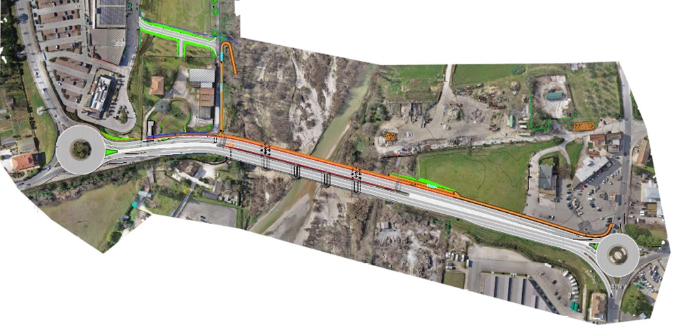 Il progetto esecutivo, redatto all’interno dell’ufficio Viabilità della Provincia, prevede la costruzione di un nuovo ponte accanto a quello esistente che presenterà una lunghezza complessiva di 180,45 metri, con le spalle in posizione leggermente più arretrata rispetto a quelle del ponte esistente per minimizzare l’impatto dell’opera sul deflusso della corrente. Verranno così realizzate altre due corsie di marcia che si andranno ad aggiungere alle due già esistenti.